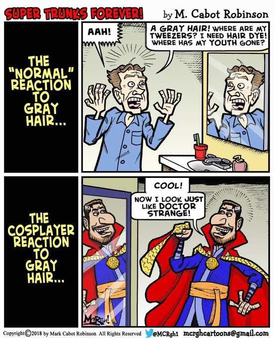 From 2018: Yes, the last panel was based on my actual reaction to seeing gray in my hair. Now all I need is a #DoctorStrange outfit with the #CloakOfLevitation! #comicstrip #cartoon #comics #grayhair #cosplay #cosplayer #superhero #MarvelComics @MCRgh1