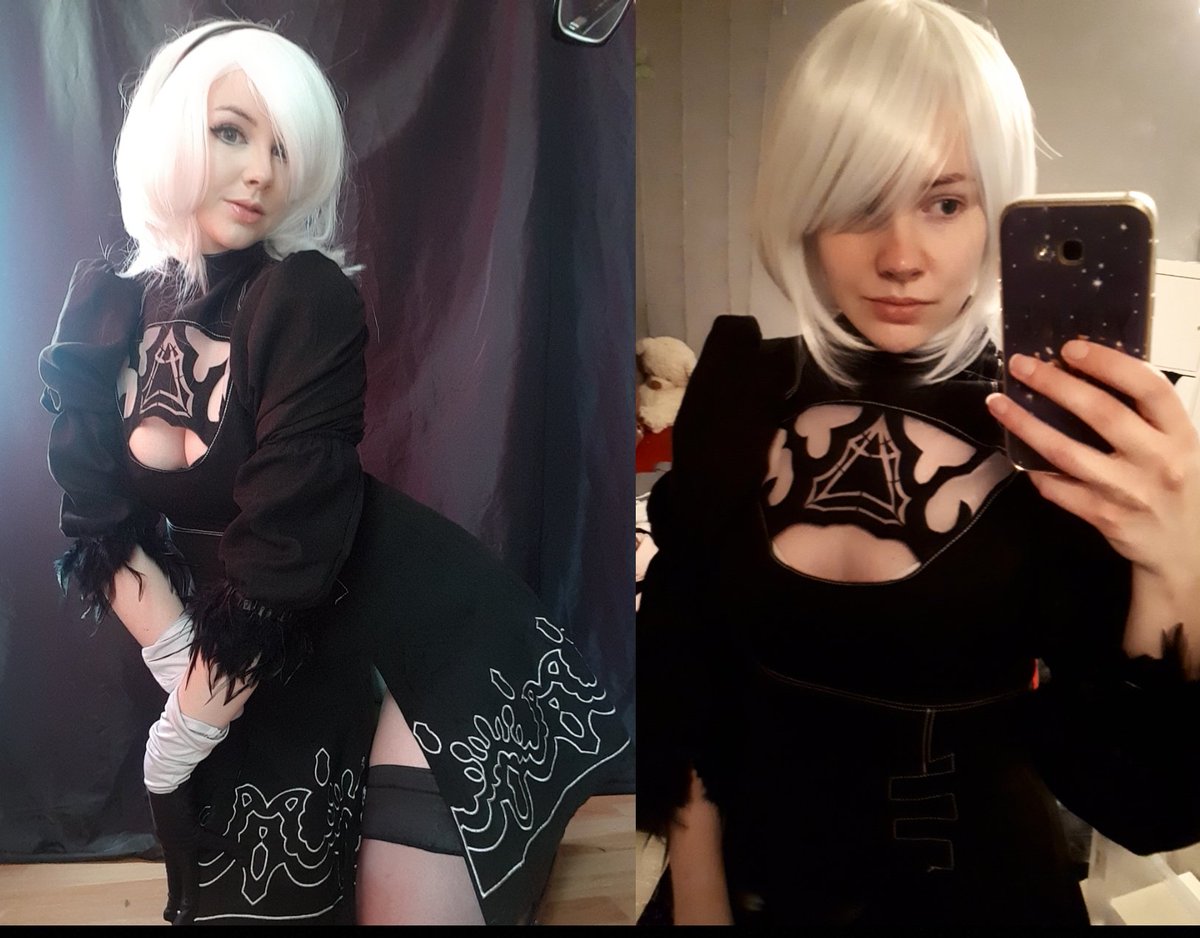 Eine neue 2B Wig 😢💖 Hachi ist happy!! Ein riesen Dank geht an die Person raus, die die Wig von meiner Amazonwunschliste gekauft hat 😭 Links seht ihr die alte und rechts die neue 😭😍 #2b #NieRAutomata #cosplay #nierautomatacosplay #2bcosplay