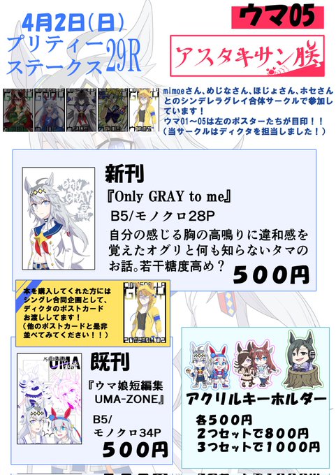 22 49 2023年4月2日(日)プリティーステークス29Rに申し込みしました!🦀 今回はオグタマ本(新刊)と既刊の短編集、アクリルキーホルダーを持っていく予定です~! 23/02/07 12:00