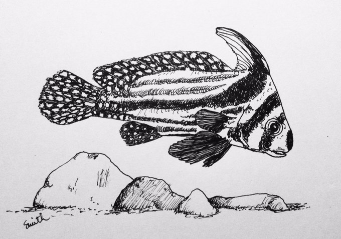 The spotted drum or spotted ribbonfish (Equetus punctatus) is found in tropical waters of the Atlantic Ocean. This pen & ink fits the “Salty” Day 17 word prompt for #Inktober because marine fish like the salty waters of the ocean. @inktober #inktober2022