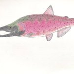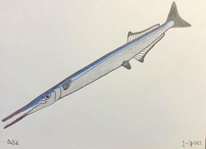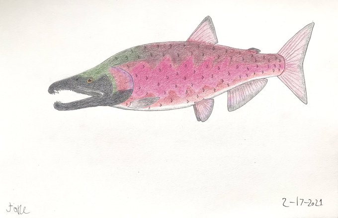 Here is my drawing of a sabertooth salmon (Oncorhynchus rastrosus) I made for #FossilFishWeek. I based the color scheme and body off of a few species in the Oncorhynchus genus. #Paleoart #FishArt
