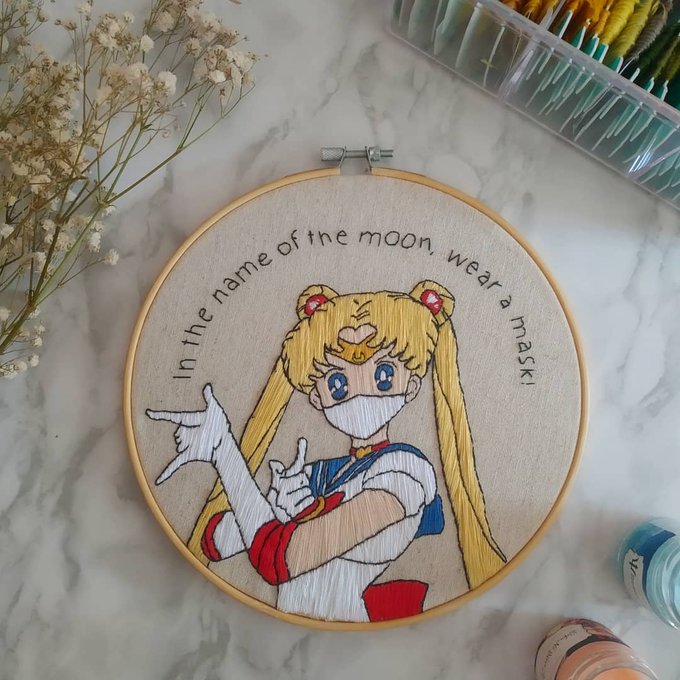 In the name of the moon, wear a mask!! 🌙✨ Estas semanas he estado bordando esta Sailor Moon, bien protegida con la mascarilla 💕🐰 #sailormoonredraw #sailormoonredrawchallenge