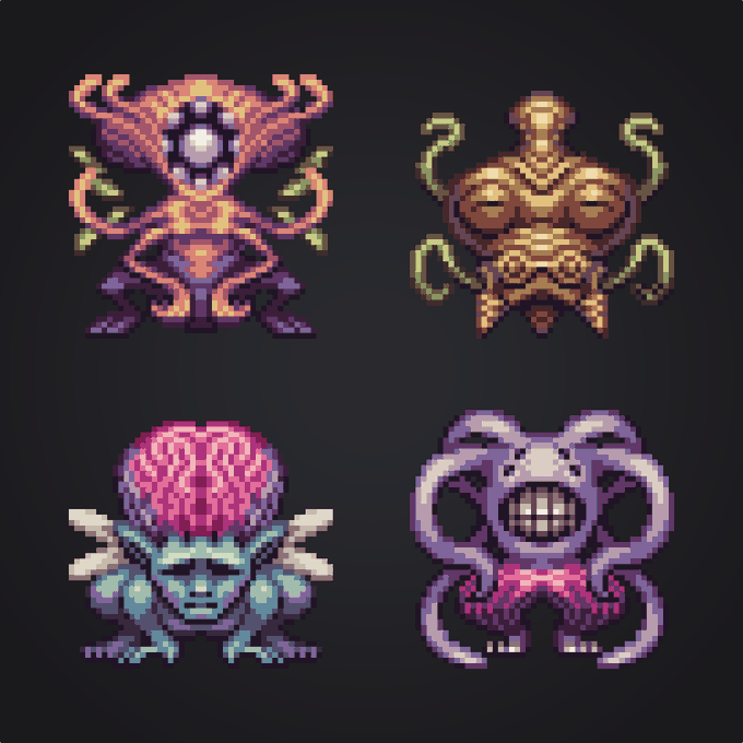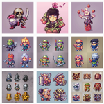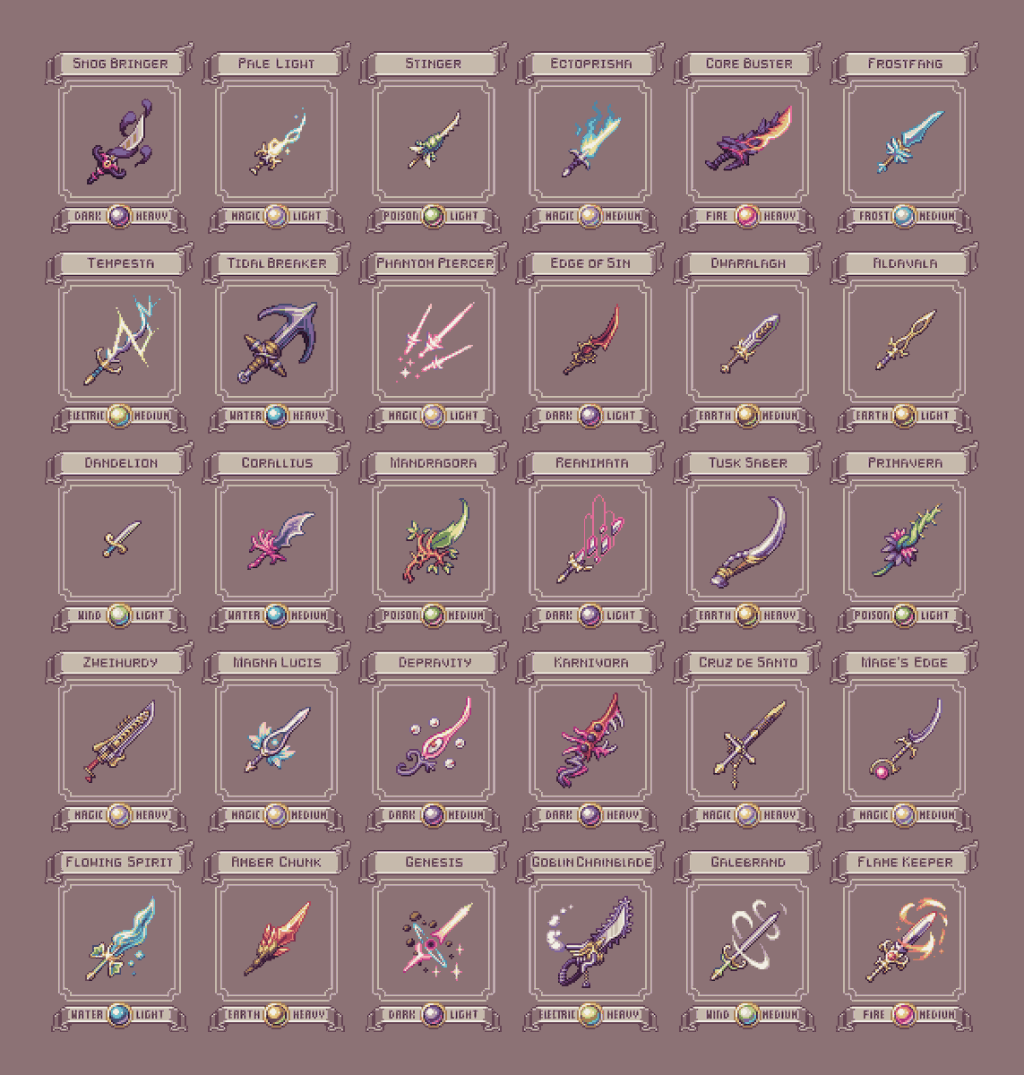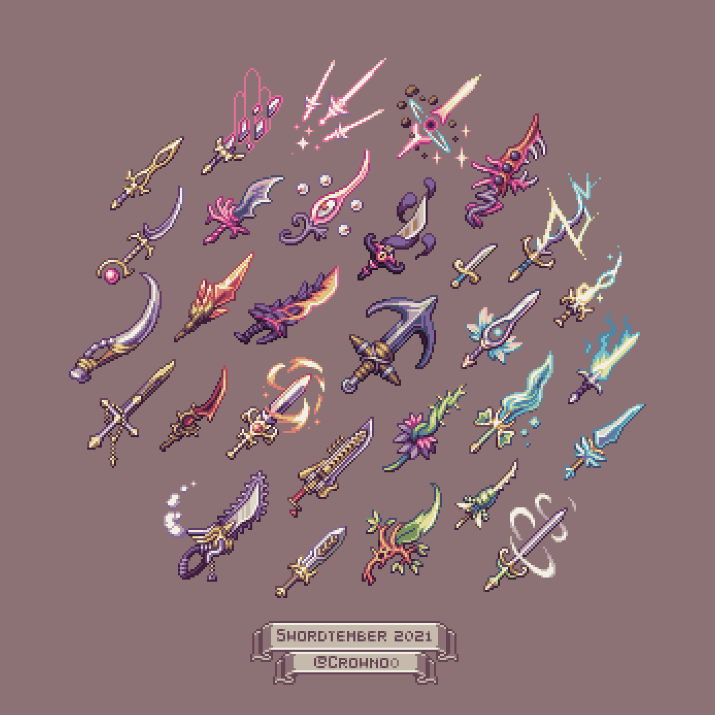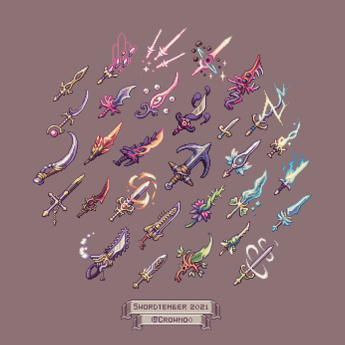 Every sword I did for #Swordtember, following the prompt list from @faith_schaffer ! This is the first time I managed to complete a challenge of this kind, albeit late. Thank you everyone who have joined me throughout this, it was super fun💜 #pixelart #ドット絵