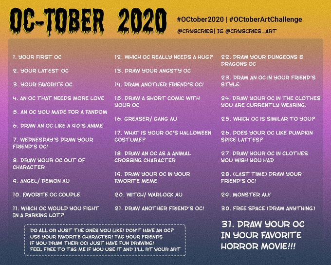 I present to you my version of #OCtober2020! Feel free to do all or some of the prompts you are interested in! This is just to revisit OCs old and new or finally do some art challenges you didn't get to do earlier in the year. Likes|RTs appreciated ! #ArtistOnTwitter