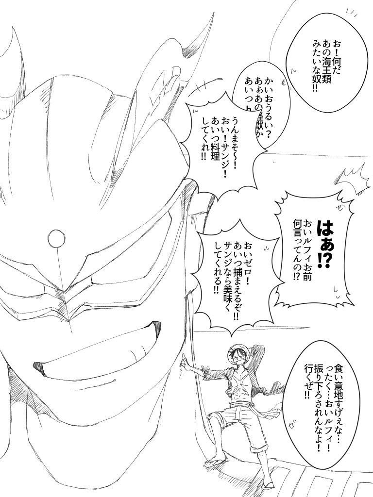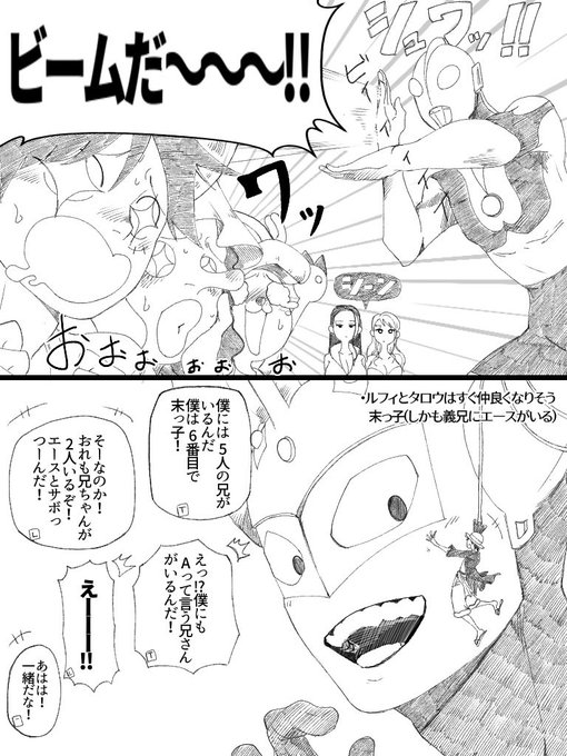 ⚠️クロスオーバー⚠️ OPとウル:トラ:マンのこの世界観みたい! 観たすぎる!! ルフィとタロウの共通点多いな…って思って勢いで描きました この2人絶対気が合う!多分ゼロも!