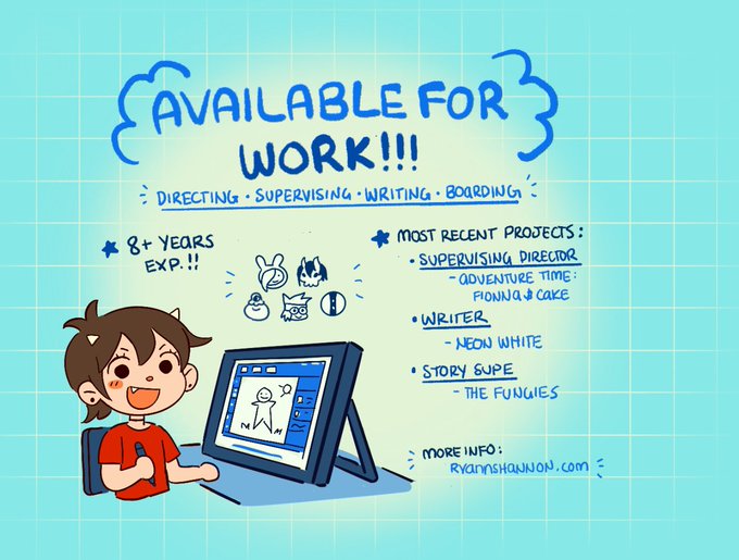 ✨Hey! I’m available for work!✨ 8+ years experience on projects like Fionna & Cake, Infinity Train + OK KO! Keep me in mind for directing/writing/boards! I’ll bring the jokes, the tears, and my expertise on kissable villains Contact+new portfolio site: ryannshannon.com