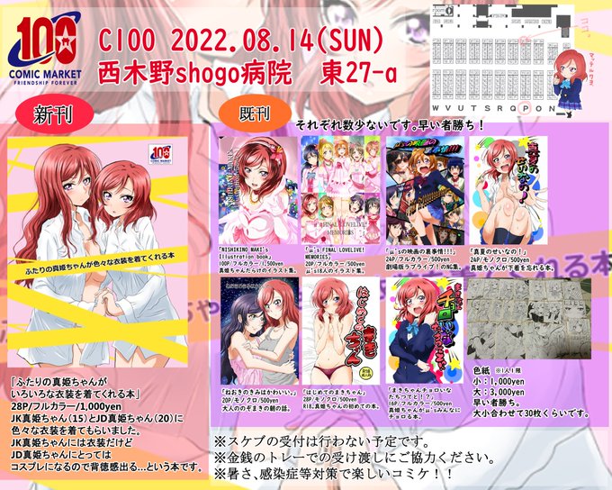 #C100 お品書きになります 当日はみらいさき(@Siraume_Saki )さんが真姫ちゃんで売り子をしてくれます!!! 二日目 東P-27aでお待ちしてます🍅 当日来れない方はメロンブックスさんで!→ melonbooks.co.jp/detail/detail.…