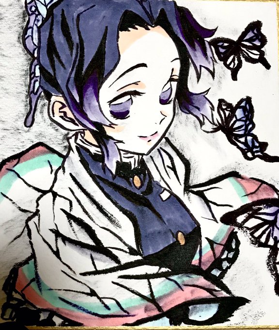 4 30 #鬼滅の刃イラスト 筆ペン色紙描き 胡蝶 しのぶ描いてみた。リクエストになります☺️ 20/06/07 20:17