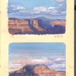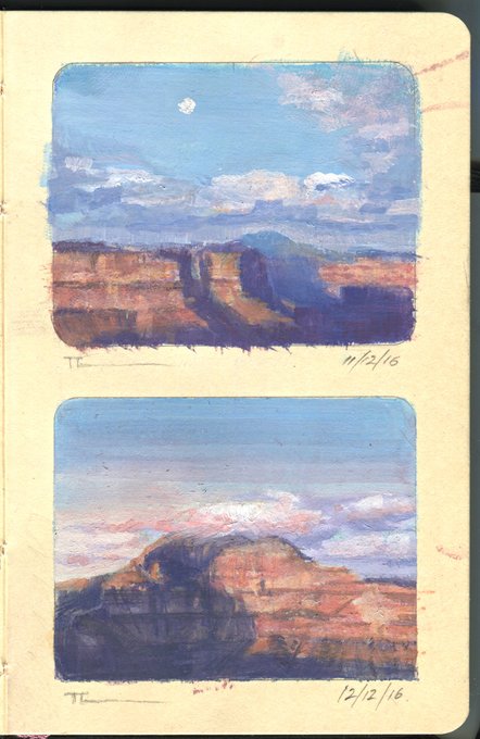 Goauche thumbnails in a little sketchbook . Each is about 8cm wide - I found doing these invaluable for learning to paint and learning to simplify - I need to get back to doing these - also a perfect way to do multiple studies - #landscapepainting #gouache #sketch #sketchbook