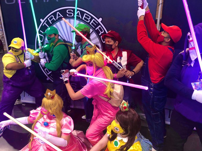 This was hands down one of my favorite moments at #Wondercon2022 where it was a #mariobros smack down at the @ultrasabers booth! Who won? Bad answers only! @RyanOMGa #Nintendo #cosplay #cosplayergirl #PrincessPeach #starwars