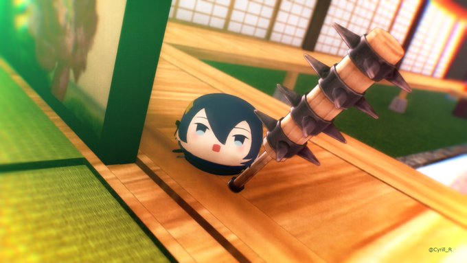 お題:お届け物でーす (ぴんぽーん!) (みかづきむねちかどのから) (おとどけものでーす!) えっ?三日月さん修行中なんだけど…まさかもちちかたち、三日月さんと特別回線でも繋がってるの!? (ふふふ…とりあえずこれは、しょうわ、からのみやげだそうだ) #もちねんすけちか版お絵描き120分