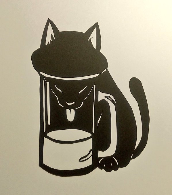 顔をぎゅうぎゅうに突っ込んで水を飲んでる猫さまいるよなぁ可愛い…って頭で作ったジョッキに顔を突っ込むオーニャー(水の色無しと有り)。 オーニャーも推し☺ベルさんとのやりとりも大好き(*´ω`*) #デラスのお品書き #ようこそデラスへ #切り絵