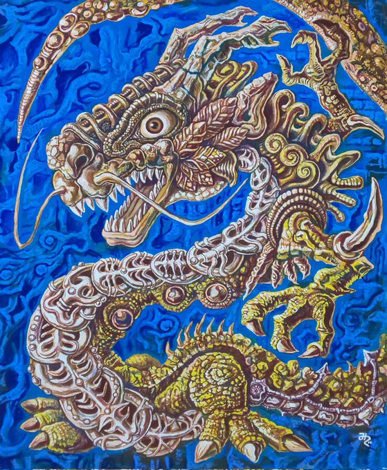 10 86 完成しました。「飾りつけた竜」 #イラスト #art #artwork #みんなで楽しむTwitter展覧会 #アクリル絵具 22/10/08 16:57