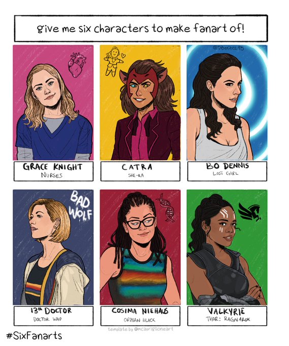 Another round of #SixFanarts ! I’m really enjoying doing a bunch of these. I’m exploring characters that I’ve never or rarely drawn before, and I’ve discovered a new colouring technique. It’s been great. Keep the requests coming 🙏🏽 I mean it when I say I’m gonna do a bunch!