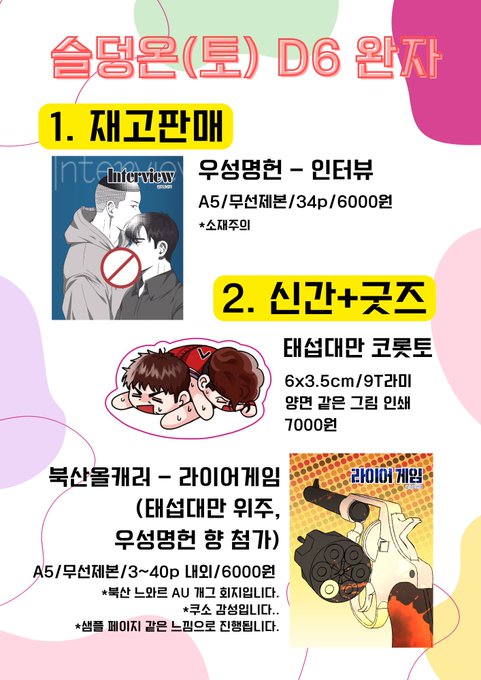슬덩온(토) D6 선입금을 받습니다. 북산 올캐러 느와르 AU 개그회지인데 이제 태섭대만이 메인이고 우성명헌 향을 첨가한..회지와.. 태대 코롯토와 우명 회지 재고를 판매합니다. 샘플을 참고해주세용 📅8월 14일 19:14~8월 18일 12:00 🔗witchform.com/deposit_form/4…
