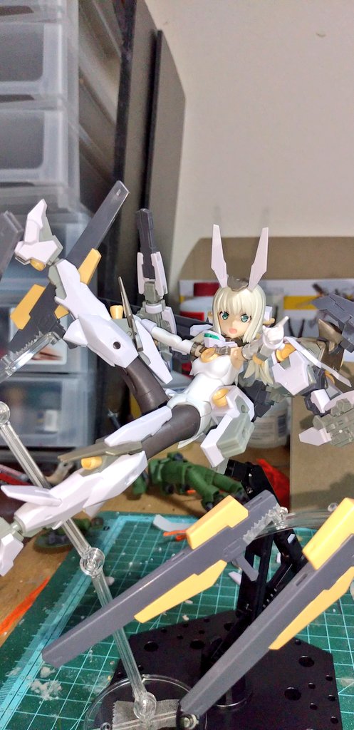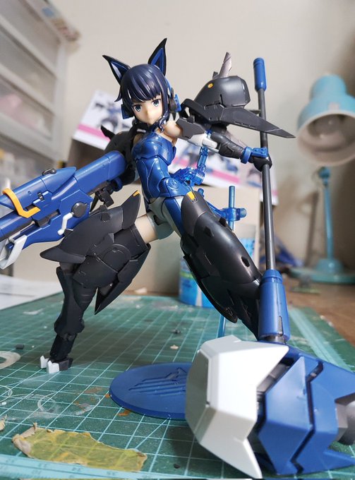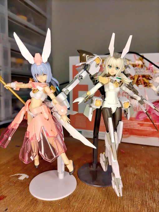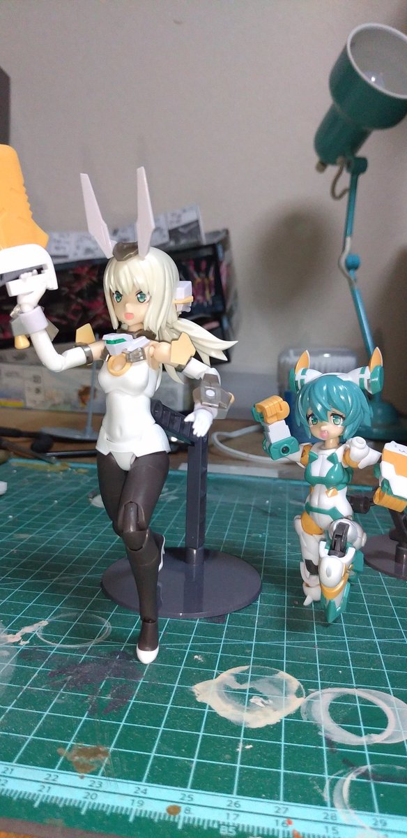スタンド複数で撮影。バンダイの台座にブキヤのプラモを乗せる夢のコラボです。 #メガミデバイス #フレームアームズ・ガール