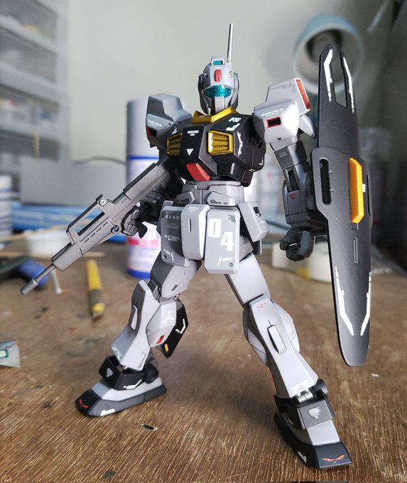 HGUCネモ塗装しました 黒サフとグレーサフだけでもガンプラはカッコよくなるのでは…? と思い付き、サフをメインカラーにアレコレ付け足して仕上げました。我ながら満足です #ガンプラ