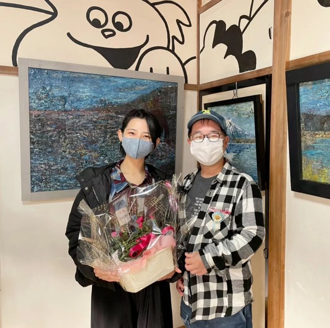 1 9 シンガーソングライターのTakahiroさんが油絵展にきてくれました😆✨ 音楽とアートは感覚が近くてめちゃ話が盛り上がりました✨ お花もありがとうございました〜✨ 明日は油絵展お休みです。 #栃木市 #絵本 #イラスト #デザイン #絵 #栃木県 #出版 #幼稚園 #読み聞かせ #展覧会 #油絵 22/12/04 20:14