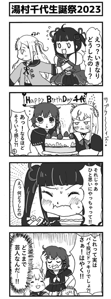 7 26 #湯村千代生誕祭 #湯村千代生誕祭2023 2日遅れちゃったけどお誕生日おめでとうございます。たくさん荒湯生キャラメル食べて大きくなるんやで そんな感じで(?)ゆるっと4コマを描きました。有馬姉妹初描きだったので楽しかったです 23/07/17 12:00