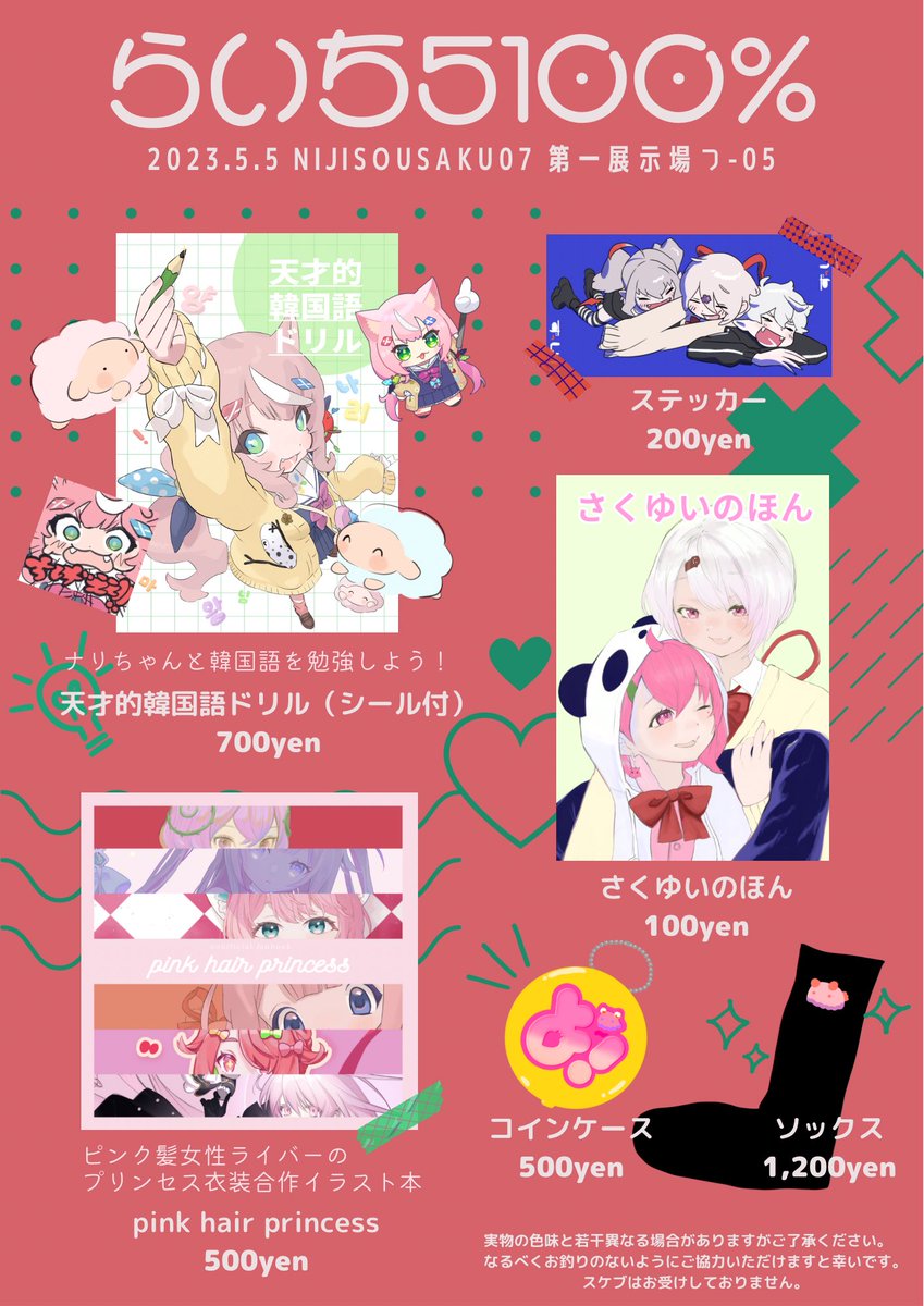 18 58 5月5日の #にじそうさく07 おしながきです‼️ ポンチ・フルーツさん(@ponchin_juicy)とOTTACKさん(@ottackdayo)と合同スペです。 よろしくお願いします〜 23/04/30 18:37
