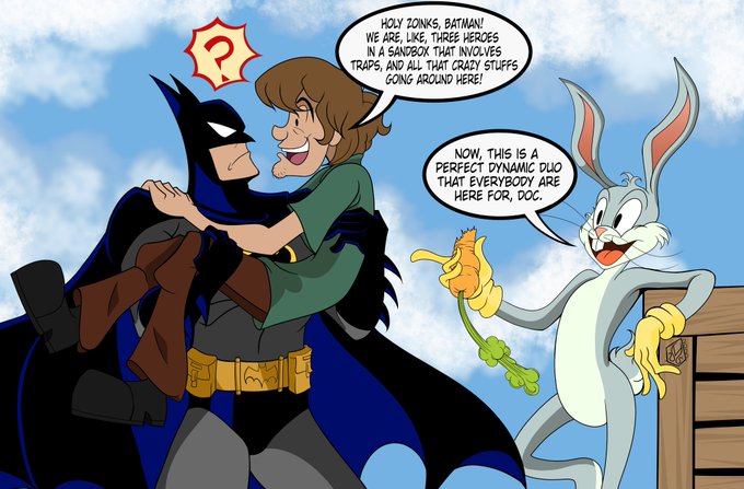 The gang are back together in a trio.😁 I decide to draw an interaction scene between Batman, Shaggy and Bugs Bunny, giving the idea of a dream team-up, or in an awkward situation, that is. #myart #multiversus #batman #shaggy #bugsbunny #FanArtFriday