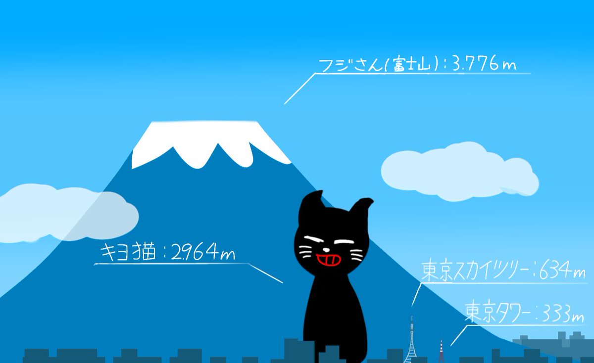 皆様のご協力により、キヨ猫さんは2964mまで成長しました!ご協力頂いた皆様、ありがとうございました~😊😊 (ちなみに二枚目のイラストは、富士山には勝てなかったことで嫌な思い出が蘇る🐱さんの図です。) #イラスト #キヨ