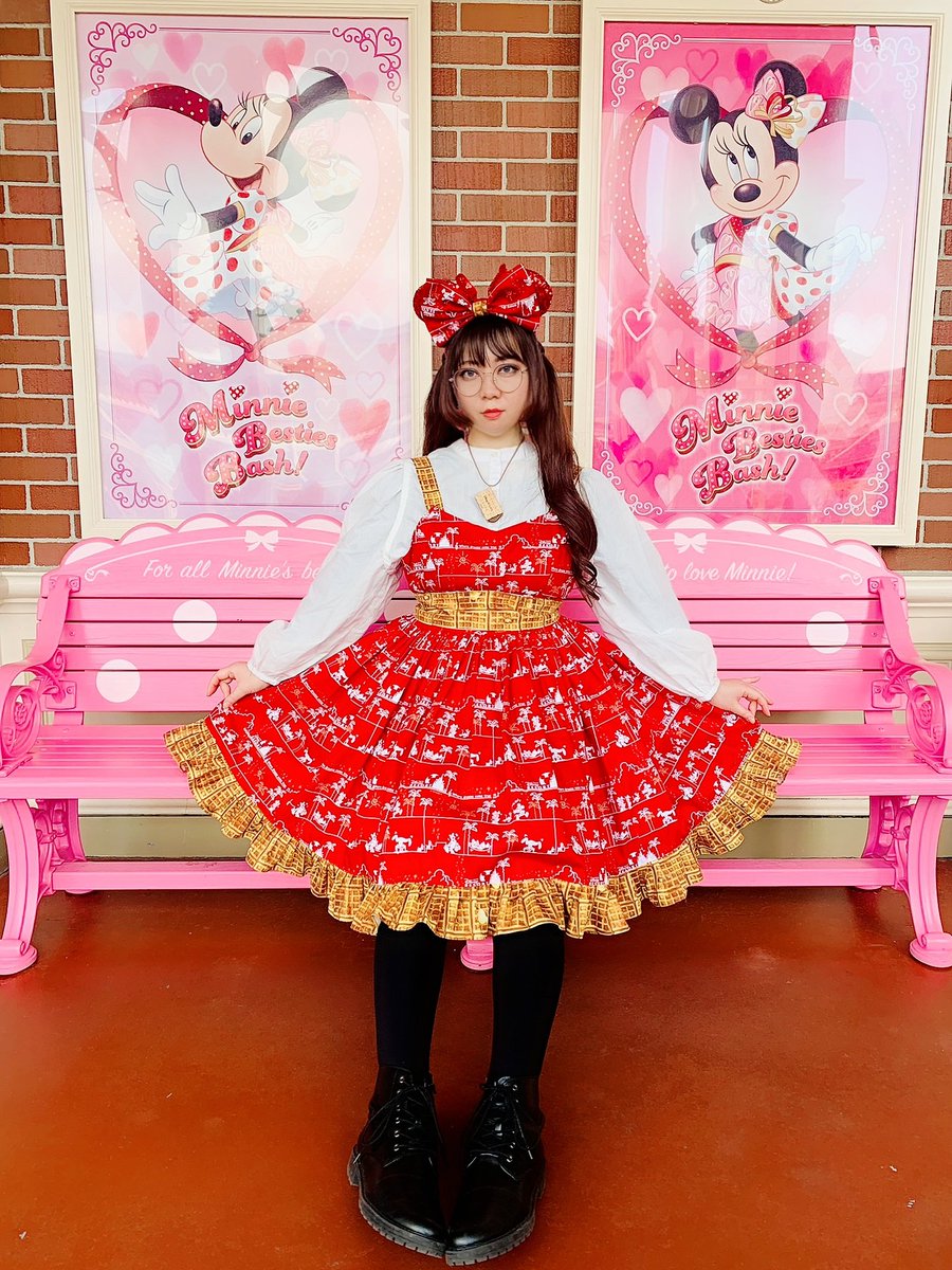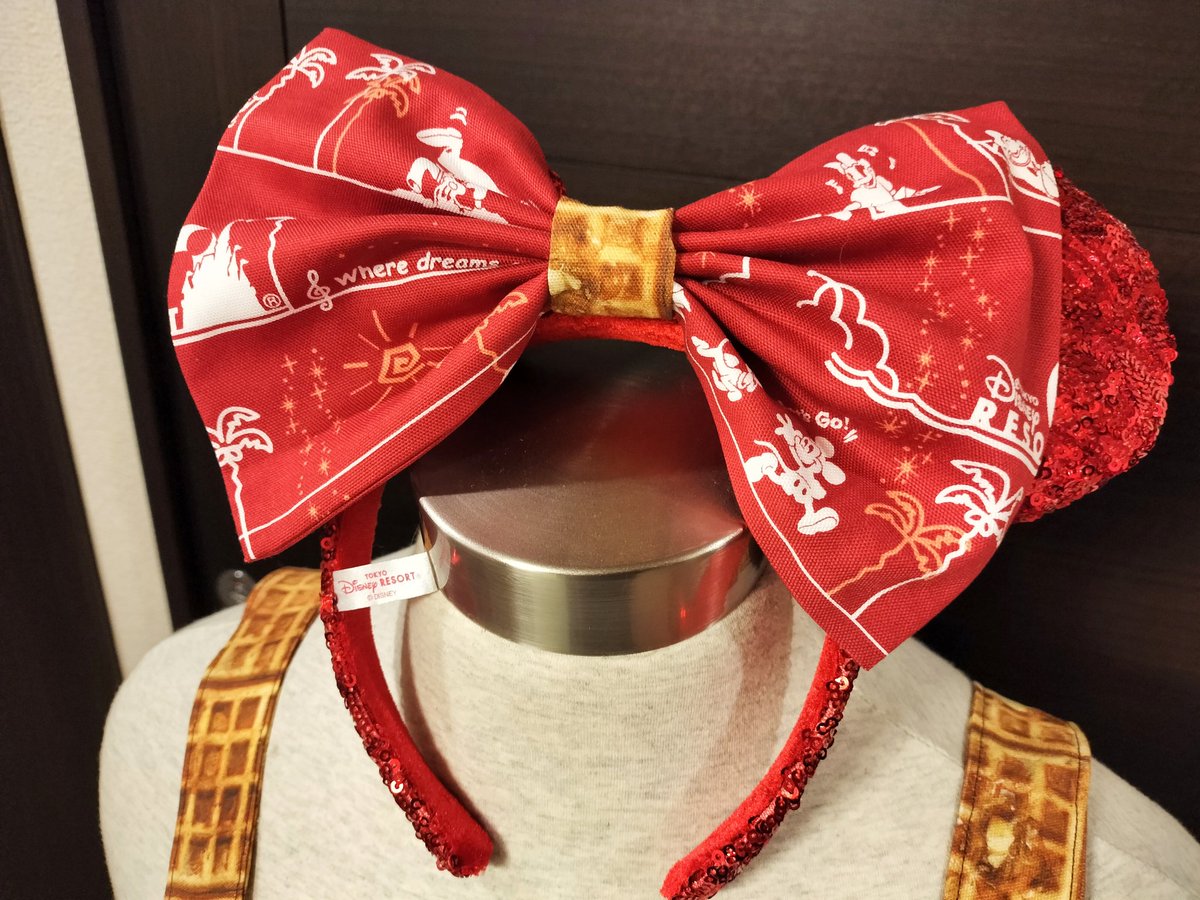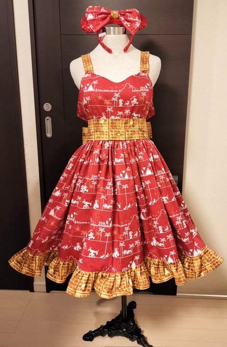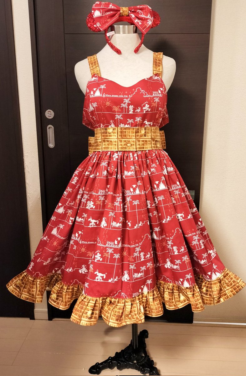 DisneyHandycraftシリーズ カットクロスでお洋服第4弾! 今年1着目✨ パークフードの容器モチーフに美味しそうなワッフルプリント生地をあわせました〜✌️ 柄×柄でイメージしてたよりも派手になってしまった🤣 リボンもあわせて作ったのでカチューシャに合わせて使う! #あきらさんの衣装備忘録