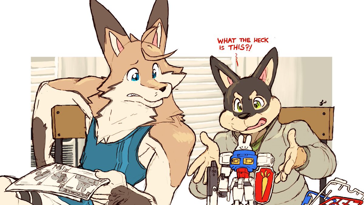 Theo (fox) and Bear (shibe) built a quality Gundam.