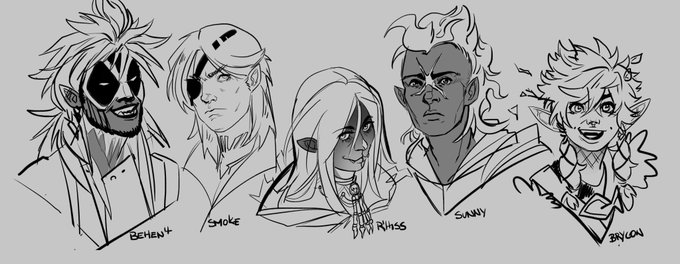 Headshot of five of my Dnd characters (not counting backups, etc) From left to right Behen't, Half orc Archer Smoke, Half elf Hexblade Warlock R'hiss, Yuanti Death cleric Sunny, Fire genasi Paladin Brycon, Elf Ranger #DnDcharacter #dndartist #dndart