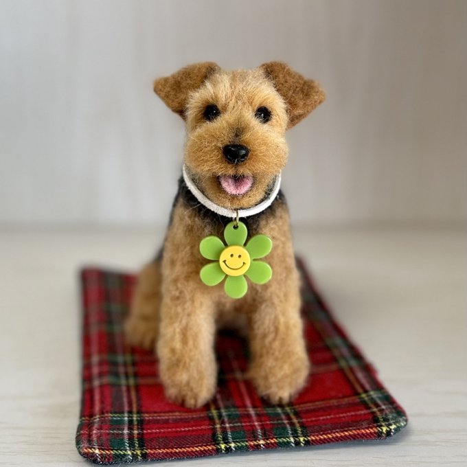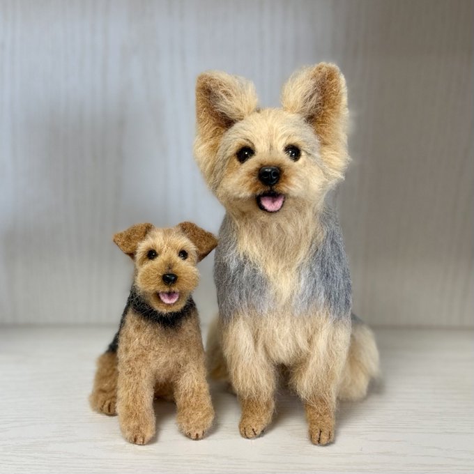 いつもより小さいサイズのウェルシュテリアさんなのですが、大きく見える😊とのコメント頂いたので過去作ヨーキーさんと並んでお写真を撮りました。何だか不思議な光景に😆 #羊毛フェルト #犬のいる幸せ