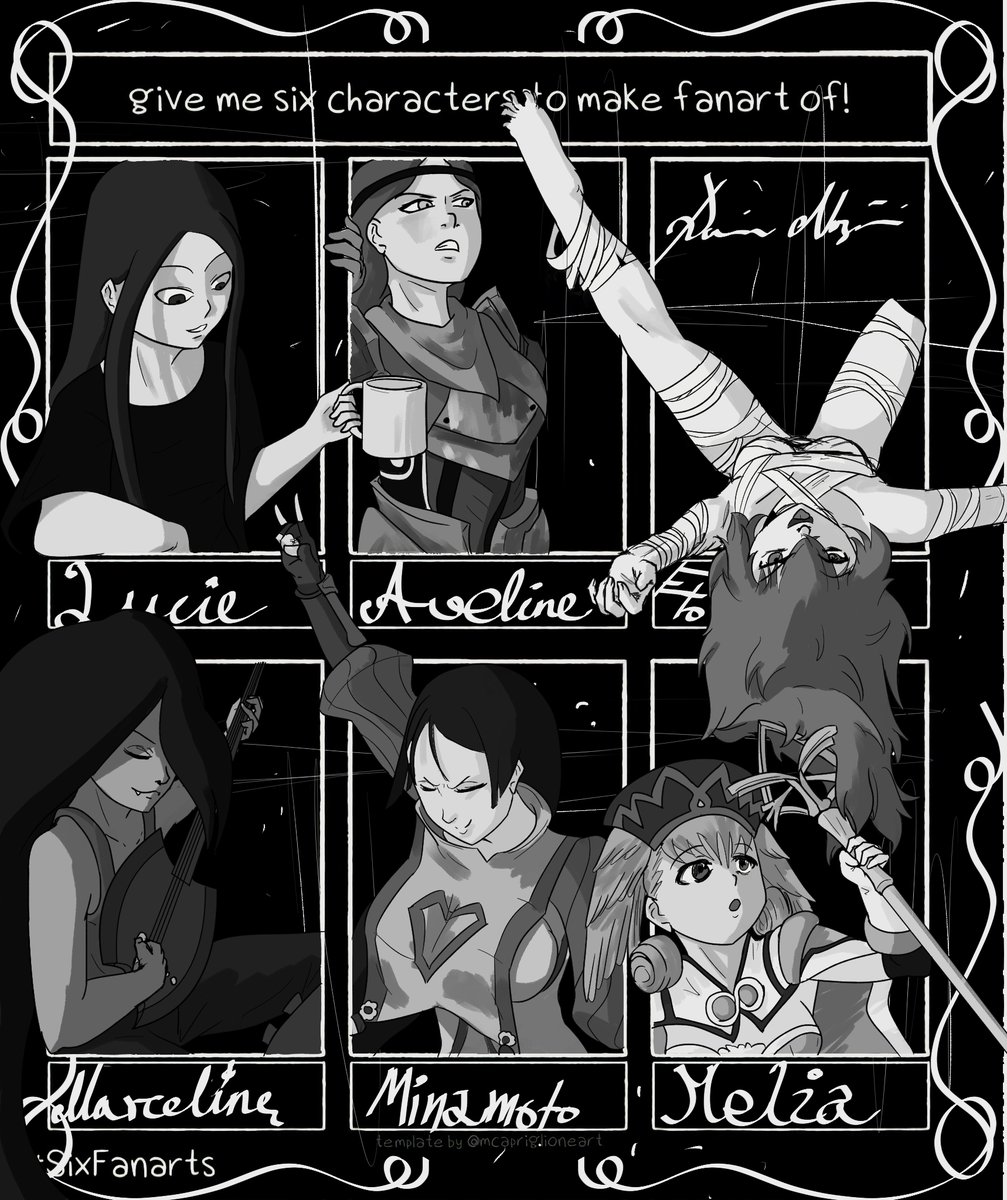 Finally did the #SixFanarts picture. Seeing it in Black and White gave me a cool idea. Thanks to @xthesilentart, @TOMs_Vision, @MysticToMat0, @lorare02, @3dVicens and @Chixydosntchuck for the characters 💜 #ArtistOnTwitter #BlackAndWhite #digitalart