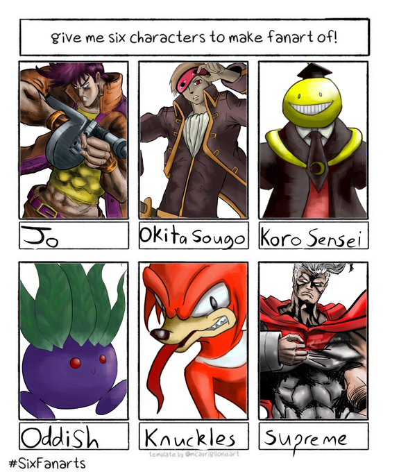 Here is my six fan arts challenge, ill post them individually tomorrow. #sixfanarts #sixfanartschallenge #jojosbizarreadventure #gintama #assassinationclassroom #pokemon #sonic #supreme