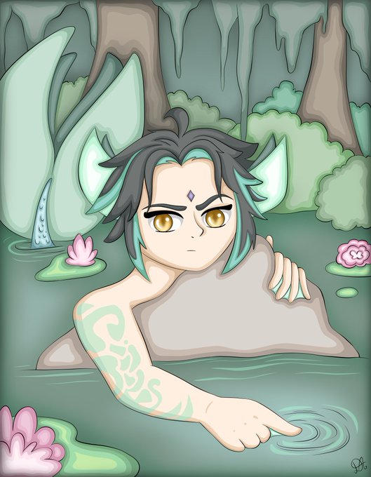 Nearly forgot to post this on Twitter!Originally I was stumped on what to draw for the prompt "Lotus Lake," but I ended up choosing to draw Xiao and I have absolutely no regrets! #Xiao #GenshinImpact #mermay #mermay2022 #genshinimpactfanart #digitalart