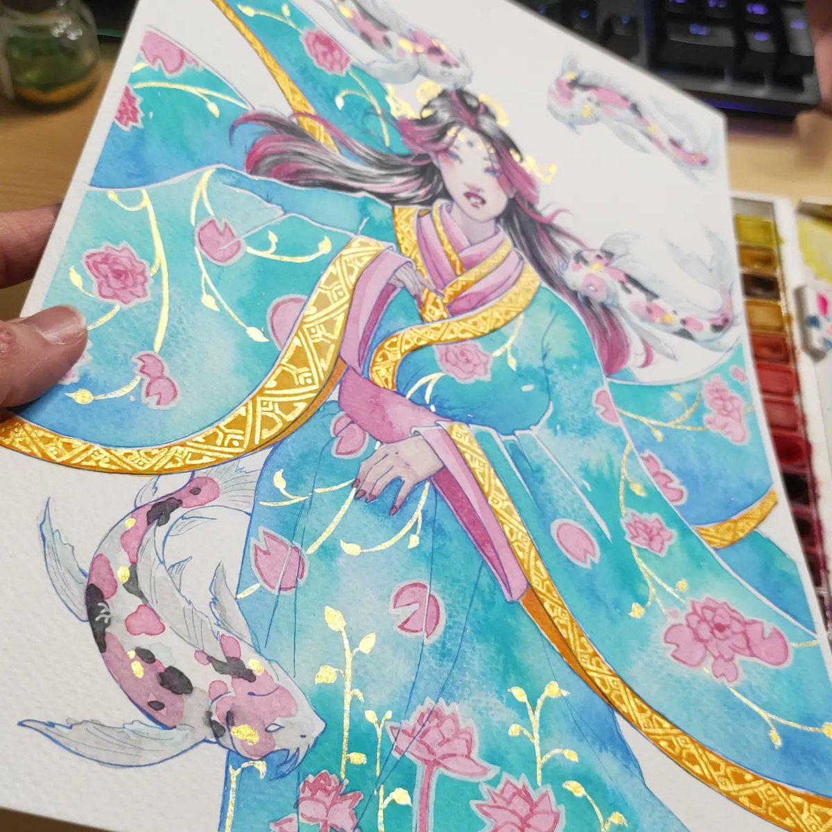 Hoy he tenido el placer de colorear esta preciosa lámina de la gran @sonia_ms_ !! Con semejante preciosidad de dibujo nada podía salir mal ❤️❤️❤️ #watercolor #watercolorpainting #goldink #portrait #soniamatas #coloreado
