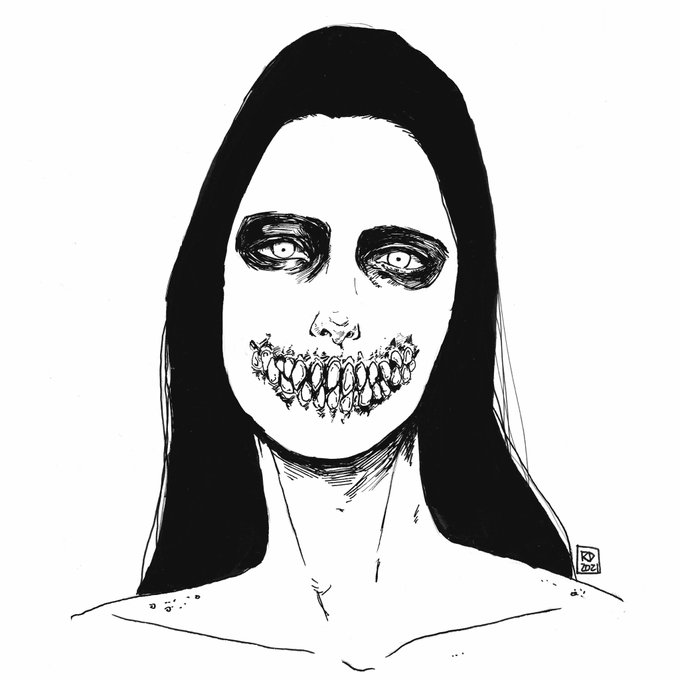 Day 26: fangs. Had time for an actual ink drawing yesterday after work so here’s this. -- #ink #inktober #inktober2021 #drawlloween #drawlloween2021 #mabsdrawlloweenclub #mabsdrawlloweenclub2021 #creepyart #spookyart #macabreart