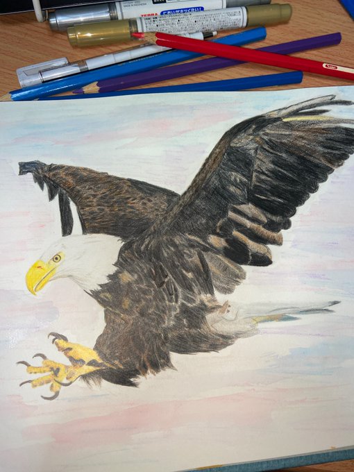 翼は雑になってしまったが、顔と脚は上手くいったいった方 色鉛筆はもっと勉強しないと #絵描きさんと繋がたい #色鉛筆