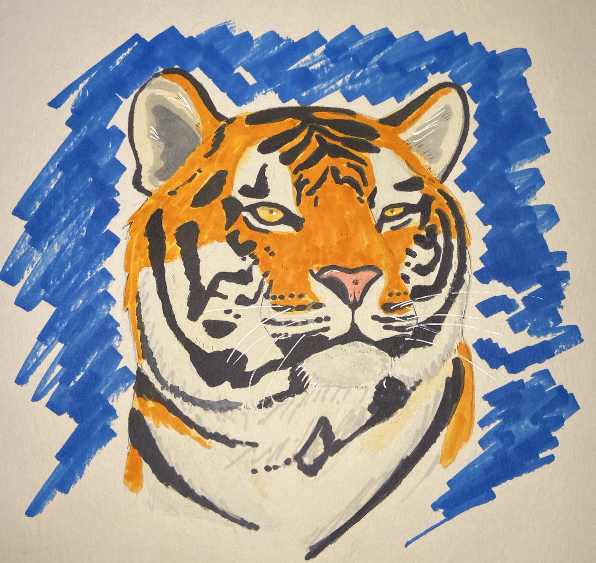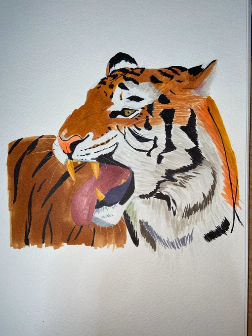 今日の虎 コピックで挑戦。前よりは上手く塗れてると思うけどすぐ適当に塗ってしまう。 でも色鉛筆で仕上げしていくとなんとかまとまった #絵描きさんと繋がりたい #コピック