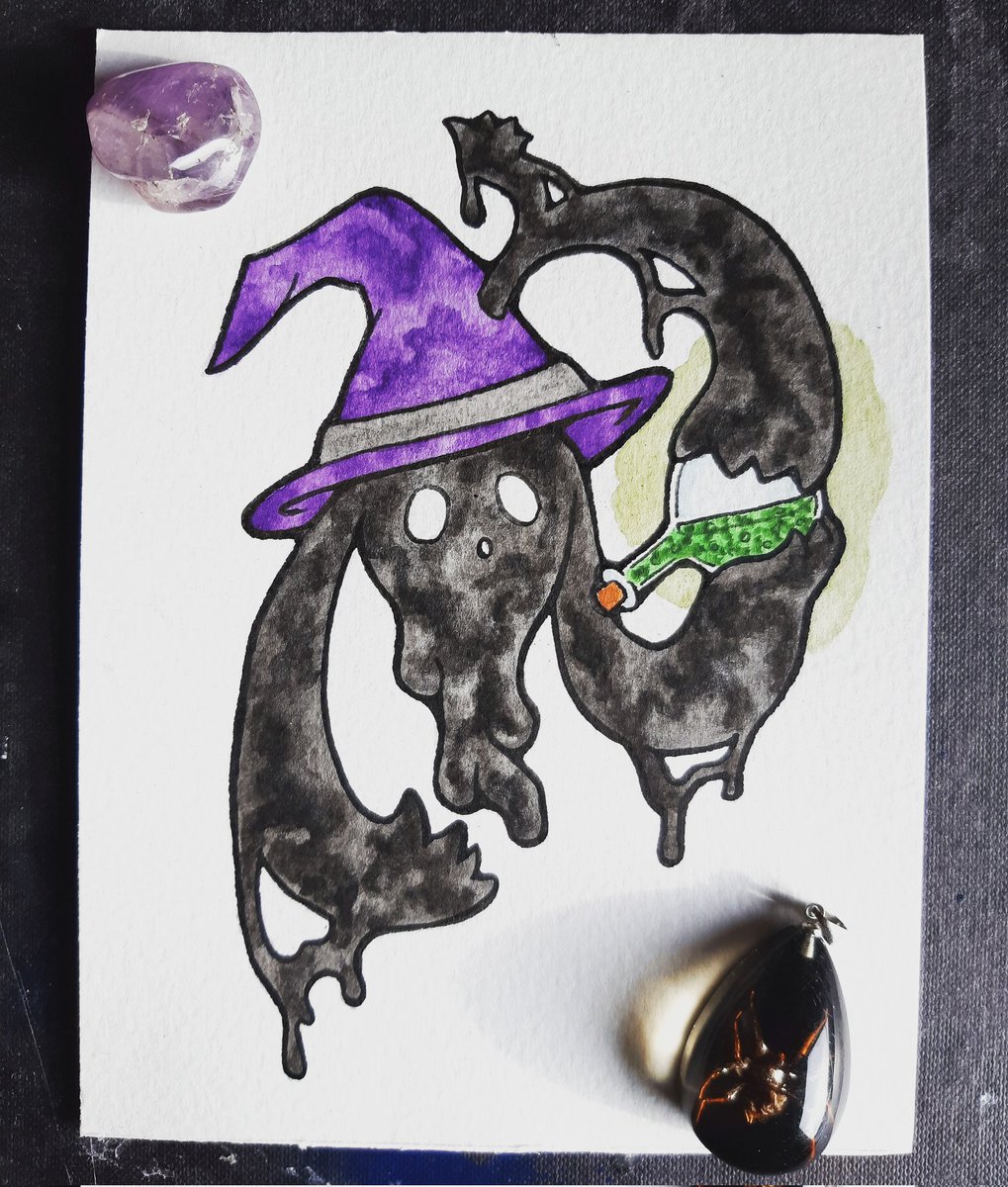 Petit fantôme voleur de chapeau de sorcière et de potion, espérant qu'il ne va rien casser ! #inktober2021 #ghost #potion #cute #Inktober #inktonerdays2
