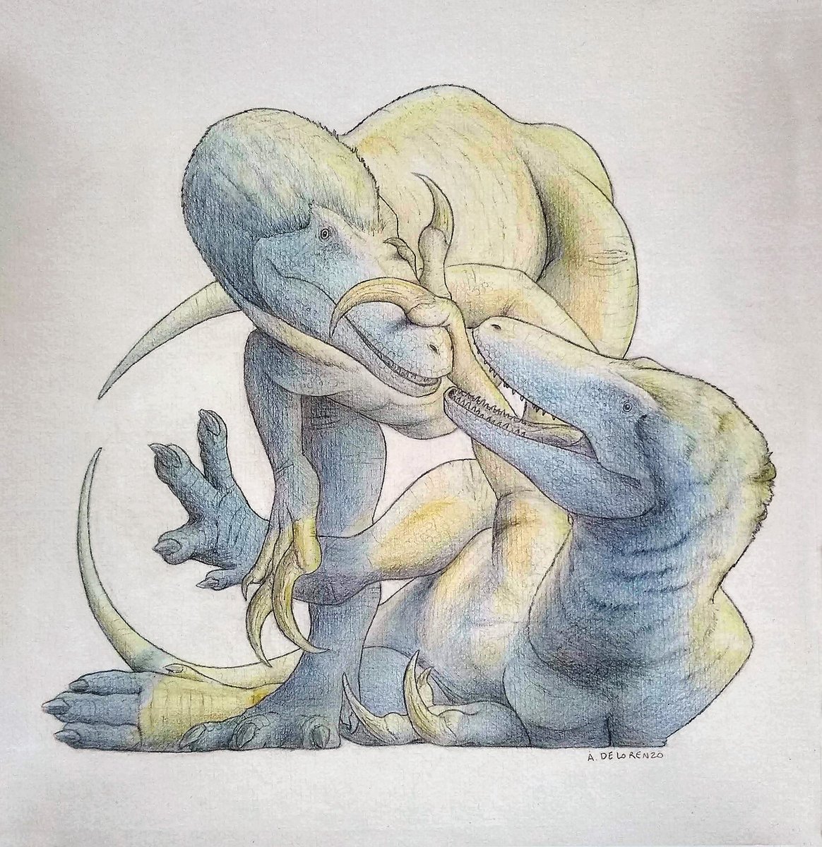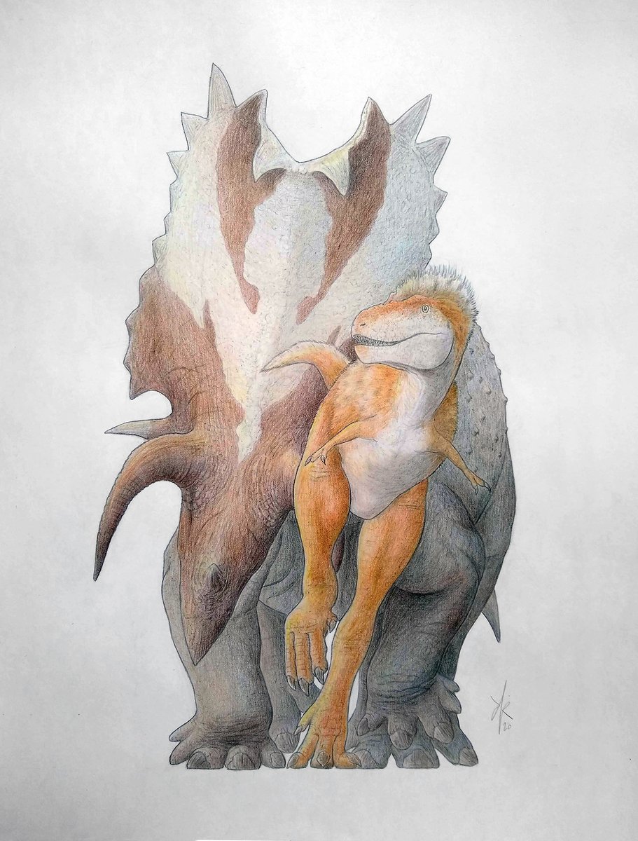 A Pentaceratops chasing away a juvenile Tyrannosaurus. (Un Pentaceratops ahuyentando a un Tyrannosaurus juvenil) #paleoart #pencils #pentaceratops #tyrannosaurus