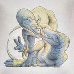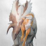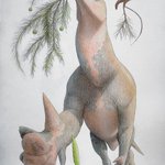 Portrait of the oviraptorid Citipati osmolskae, with a crab. Made with pencils. Retrato del oviraptórido Citipati osmolskae, con un cangrejo. #citipati #oviraptor #paleoart #dinosaurs