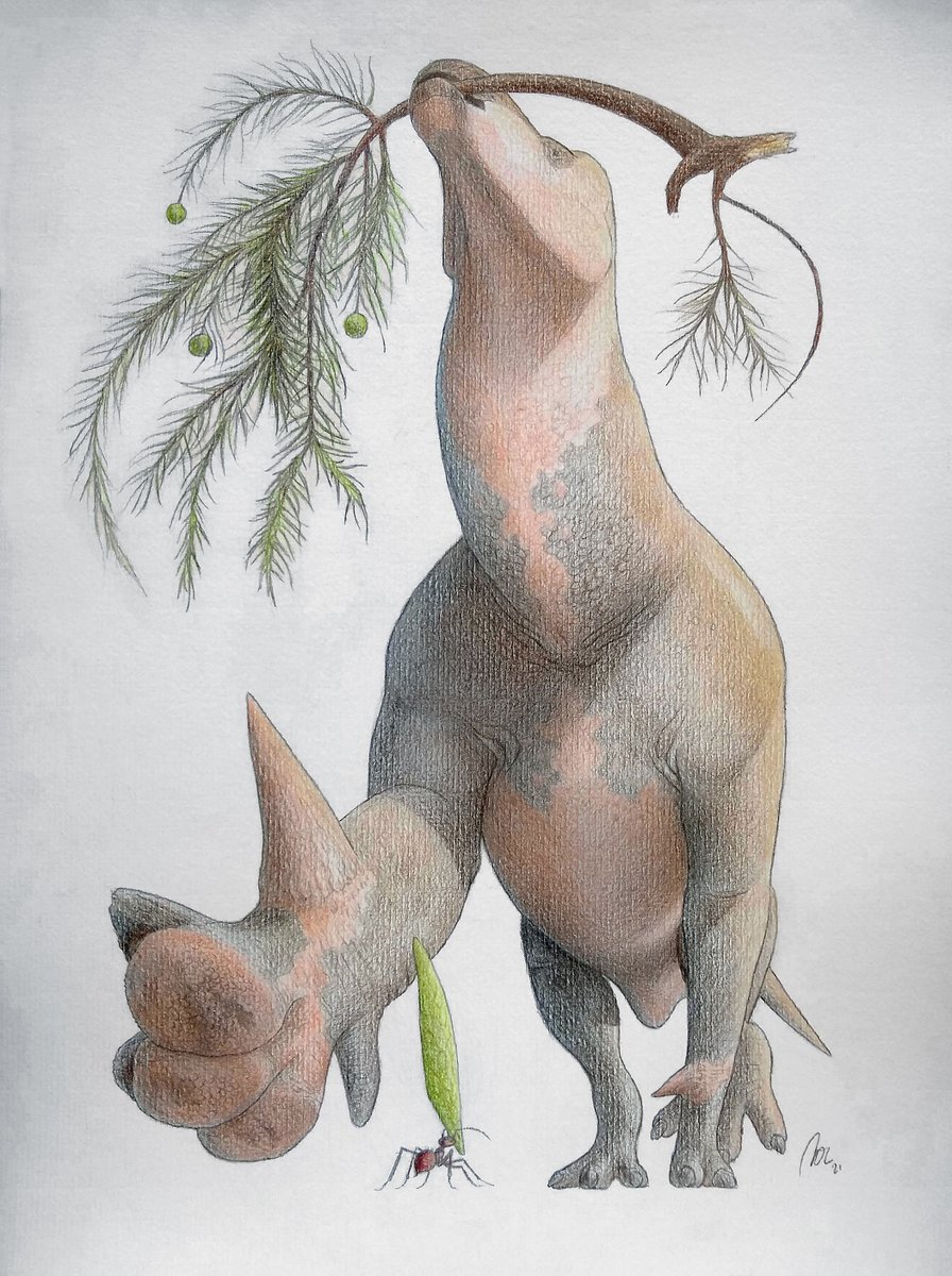 Here's an Iguanodon bernissartensis carrying material to build the nest and a little ant crossing its path with a leaf. Illustration with pencils. #paleoart #iguanodon #pencils