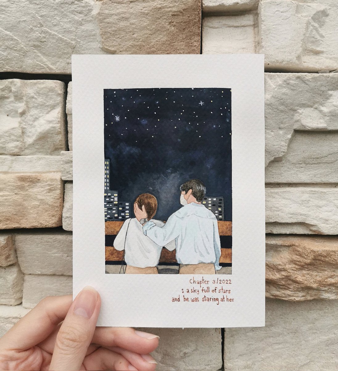 a sky full of stars and he was staring at her •.✧* #watercolor #watercolorpainting #watercolorart #drawing #sketch #painting #artwork #illustration #nightsky #couple #couplequotes #รับวาดภาพ #รับวาดรูป #ภาพสีน้ำ #ของขวัญ #ペインティング #水彩
