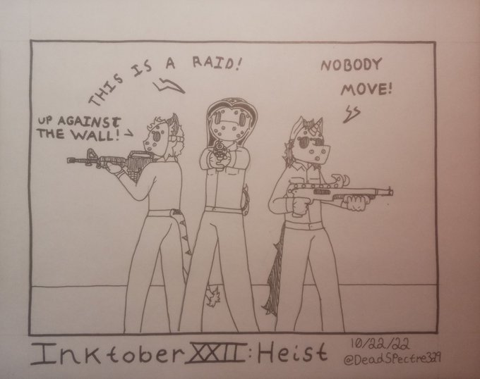 Day 22: Heist [Robber 1]: "THIS IS A RAID!" [Robber 2]: "NOBODY MOVE!" [Robber 3]: "UP AGAINST THE WALL!" #Inktober #inktoberchallenge #Inktoberprompts #inktober2022 #inktoberheist