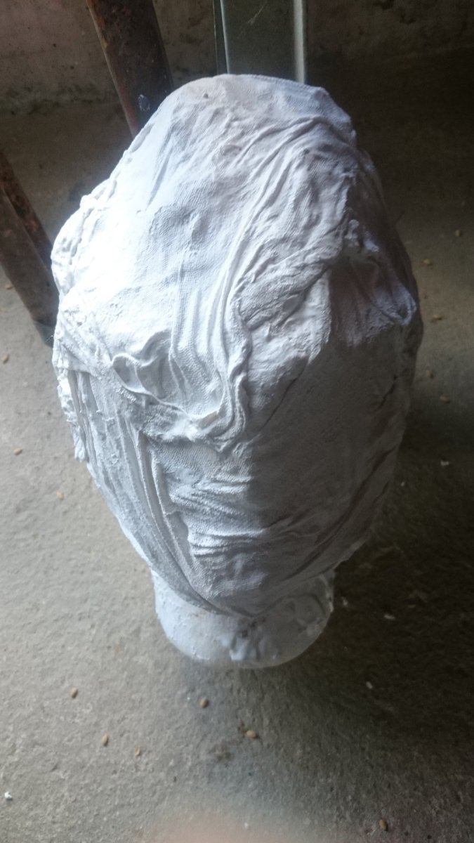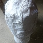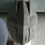 今回のお面の製作を簡単に説明しますと ①油粘土でベースを作る ②石膏で型を作る ③型にゲルポリとガラス繊維を塗り込む ④型から取り出して形を整えて塗装 となっております。