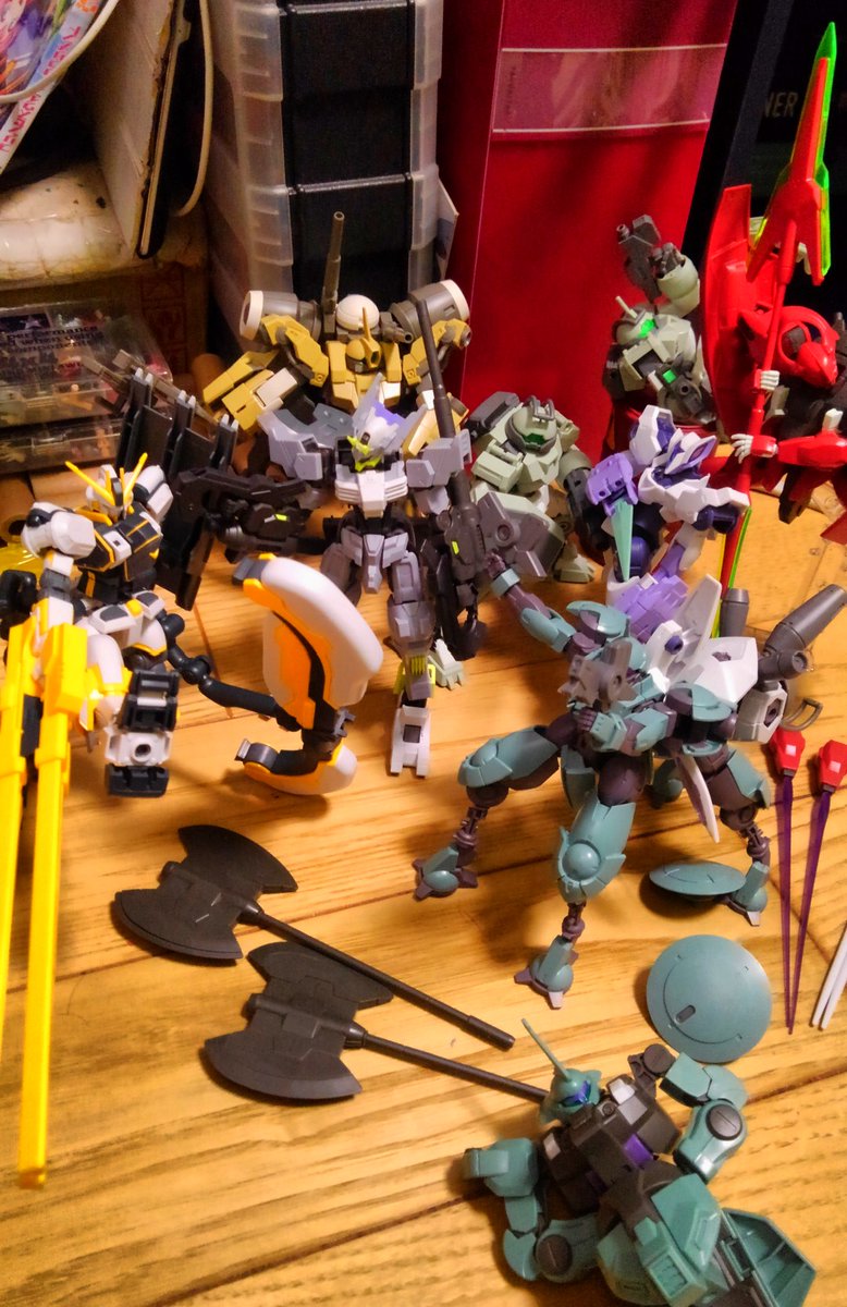 #今月作ったプラモ晒そうぜ えーと デミトレ無印、デミバ、アトラス、 ベギルベウ、変なハインドリー、無印、 あと今日ダリルバルデと、 途中だけどディラン 待ってほぼ素組みとはいえ多すぎない????