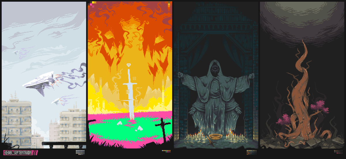Hi there #PortfolioDay, i'm Postmodern Ouroboros, i'm a pixel artist and game designer from Venezuela, these ones are some of my recent illustrations. #pixelart #ドット絵