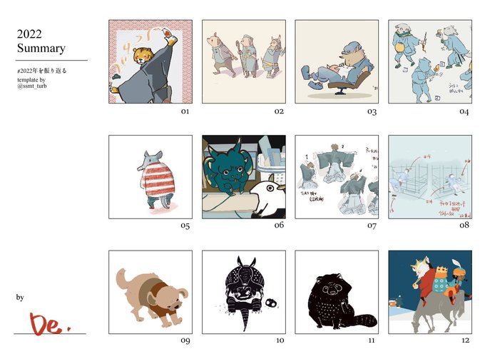 #2022年を振り返る テンプレートをお借りしました。 今年の課題以外のイラストと練習物です ジェスドロしたり、のんびり動物描いたり、 今年も楽しい1年でした🐷🐶 来年は建物や植物も描いてみたいです🏡🌿