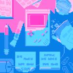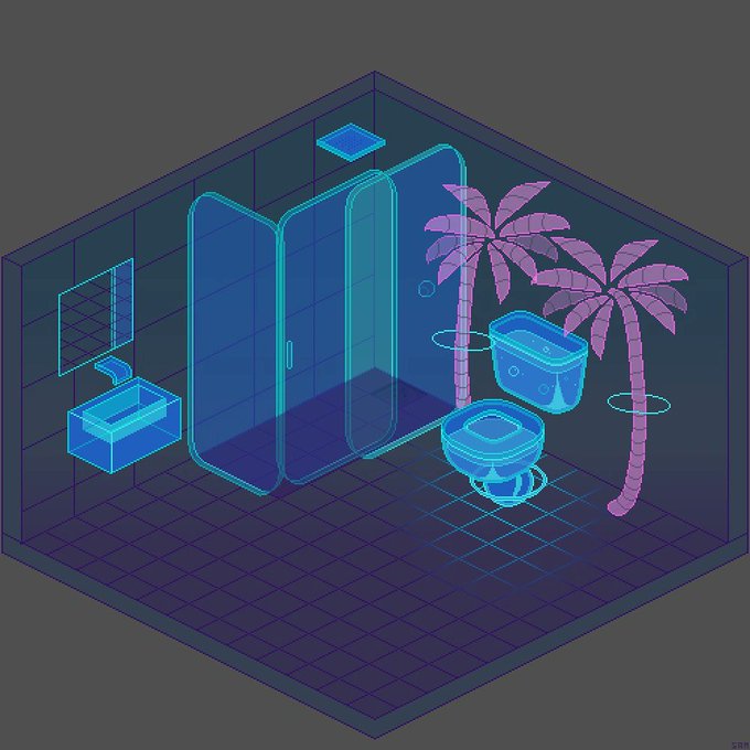Another pixel commission complete. It's a vaporwave and Y2K inspired bathroom. All appliances glow in the dark and are see-through. The palm trees are holograms. #ドット絵 #pixelart #vaporwave #Y2K #drawingwhileblack