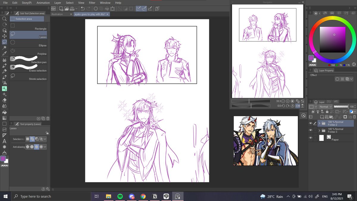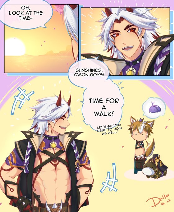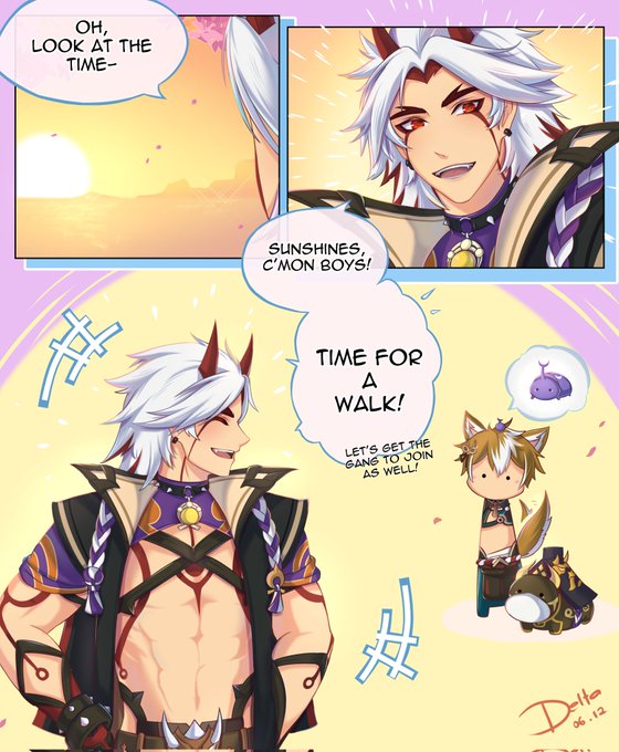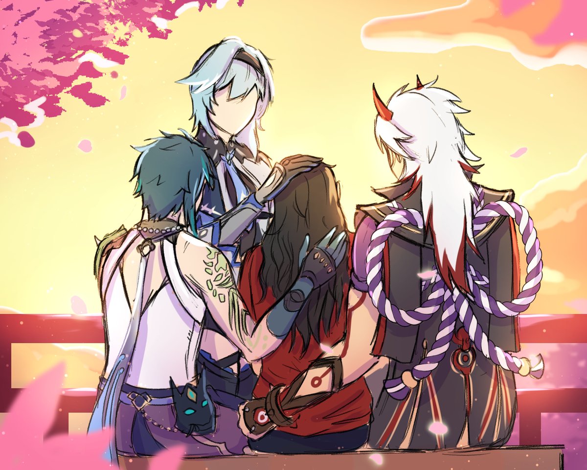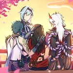 Based on what I know so far about Ayato, I headcanon that he goes to hang out with Itto whenever he can and drags Thoma along with him 😭 #Ayato #Itto #aratakiito #Aratakiitto #thoma #genshinimpactfanart