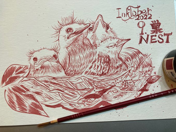 #インクトーバー #inktober2022day9 インクトーバー九日目で鳥の巣を描きました。 紙・ORIONブリタニア水彩紙(300g中目)、ホルベインドローイングインク使用。面相筆(不朽堂・匠面相)で。